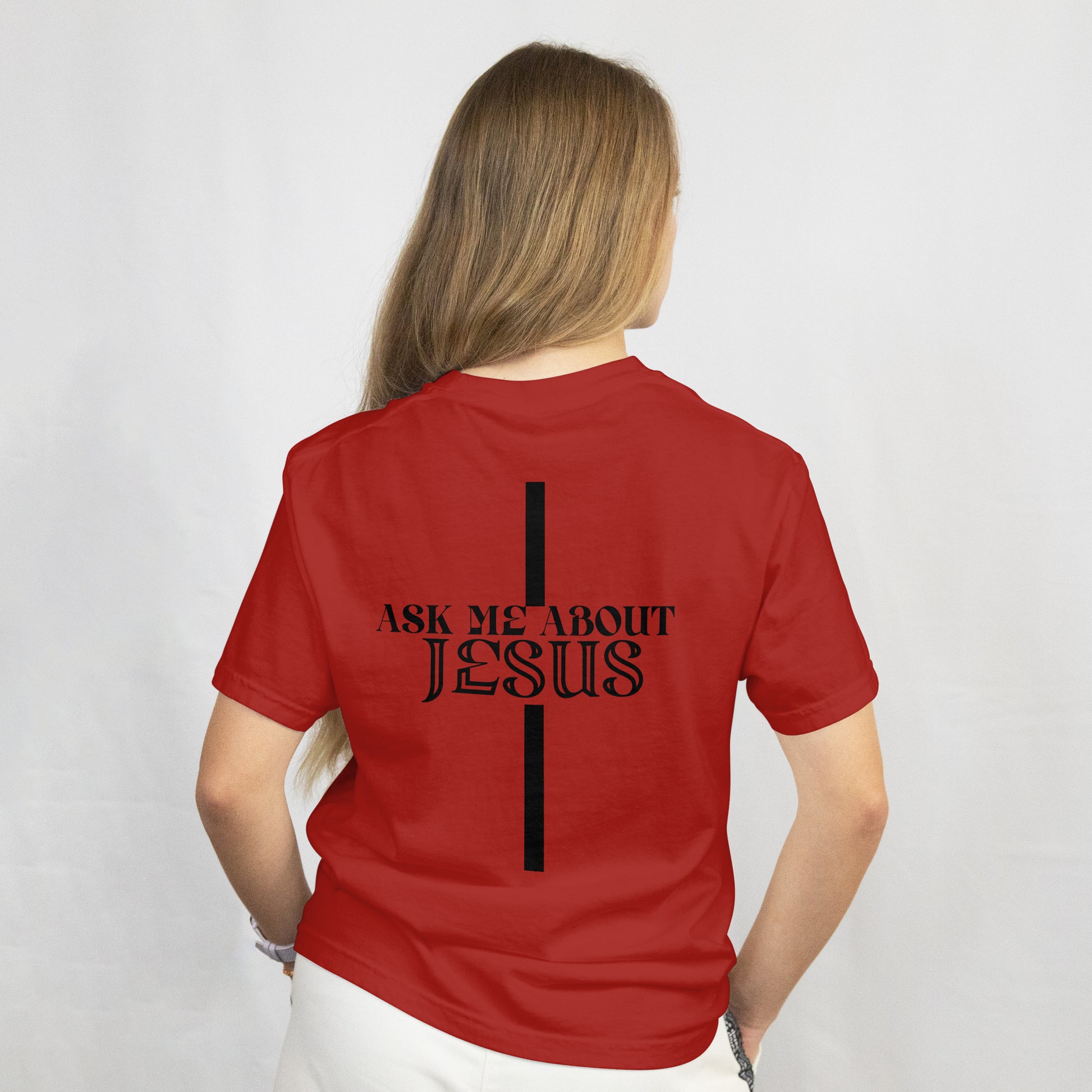 This “Ask Me About Jesus" graphic tee is printed on a high-quality soft tee, made from 100% preshrunk cotton for a soft, comfortable fit that lasts.